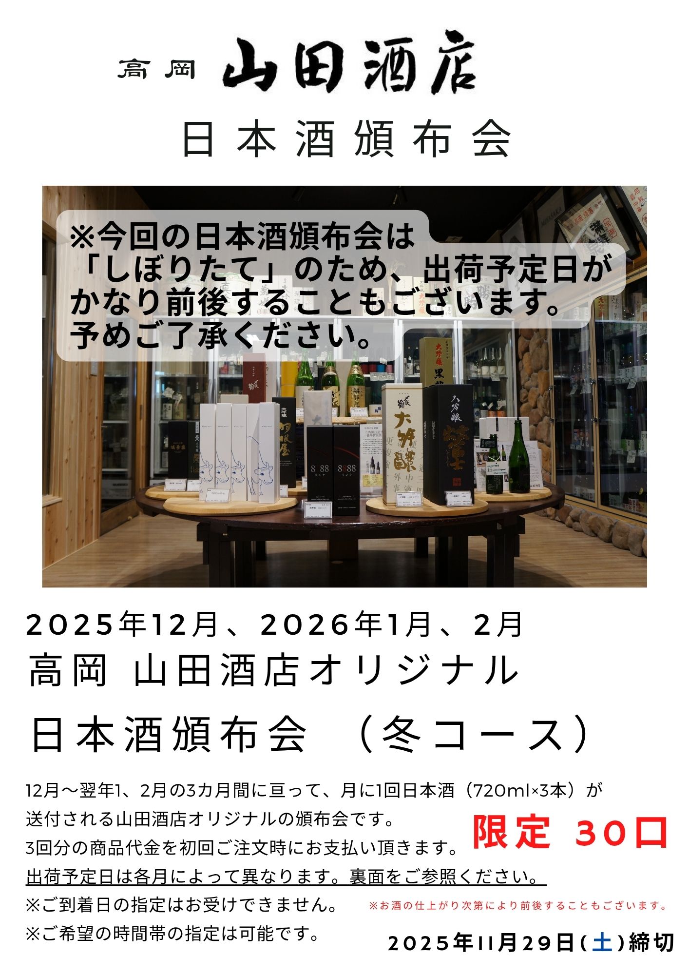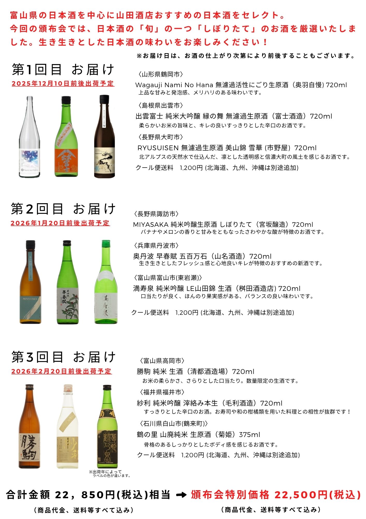 | 高岡 山田酒店オリジナル 日本酒頒布会 冬コース(限定30口) 22,500円 (税込) ※Sold out (商品代金、3回分の送料すべて込み) ※代引手数料や振込手数料はお客様ご負担にてお願い致します。 |